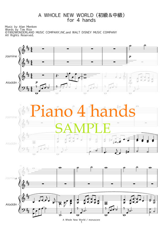 映画「アラジン」の『ホール・ニュー・ワールド』をピアノ連弾にしました。PDF5ページ。