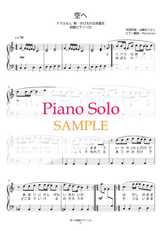 映画『ドラえもん 新・のび太の日本誕生』より、山崎まさよしさんの「空へ」をピアノソロ譜にしました。PDF2ページ。