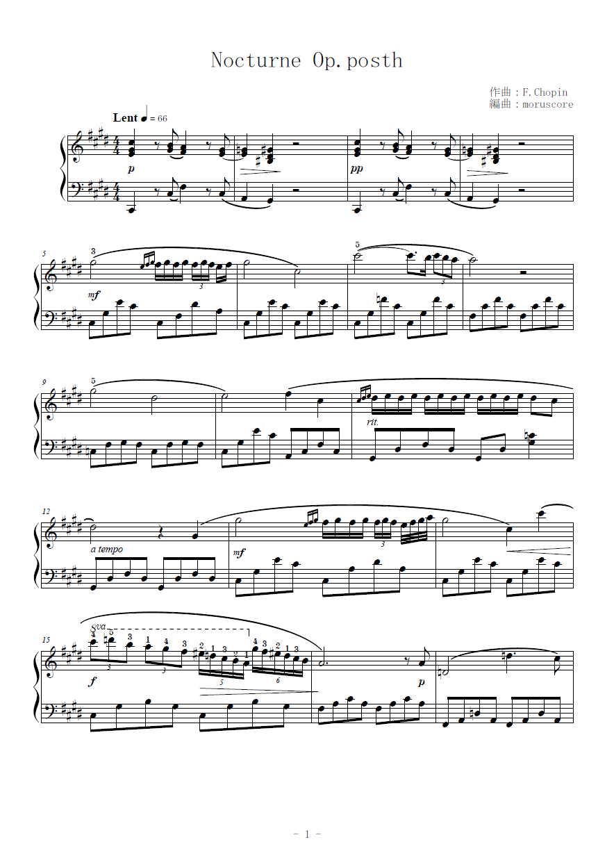 映画『戦場のピアニスト』でも有名なショパンのノクターン遺作 嬰ハ短調を少し簡単なピアノソロ楽譜にしました。