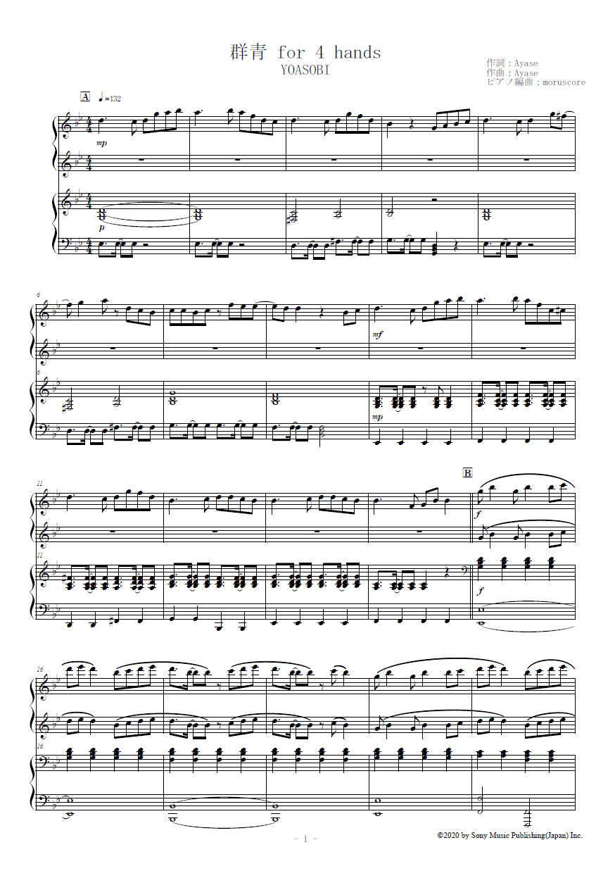 YOASOBIの『群青』をピアノ連弾にしました。どちらも主役になるようにメロディーを割り振っています。