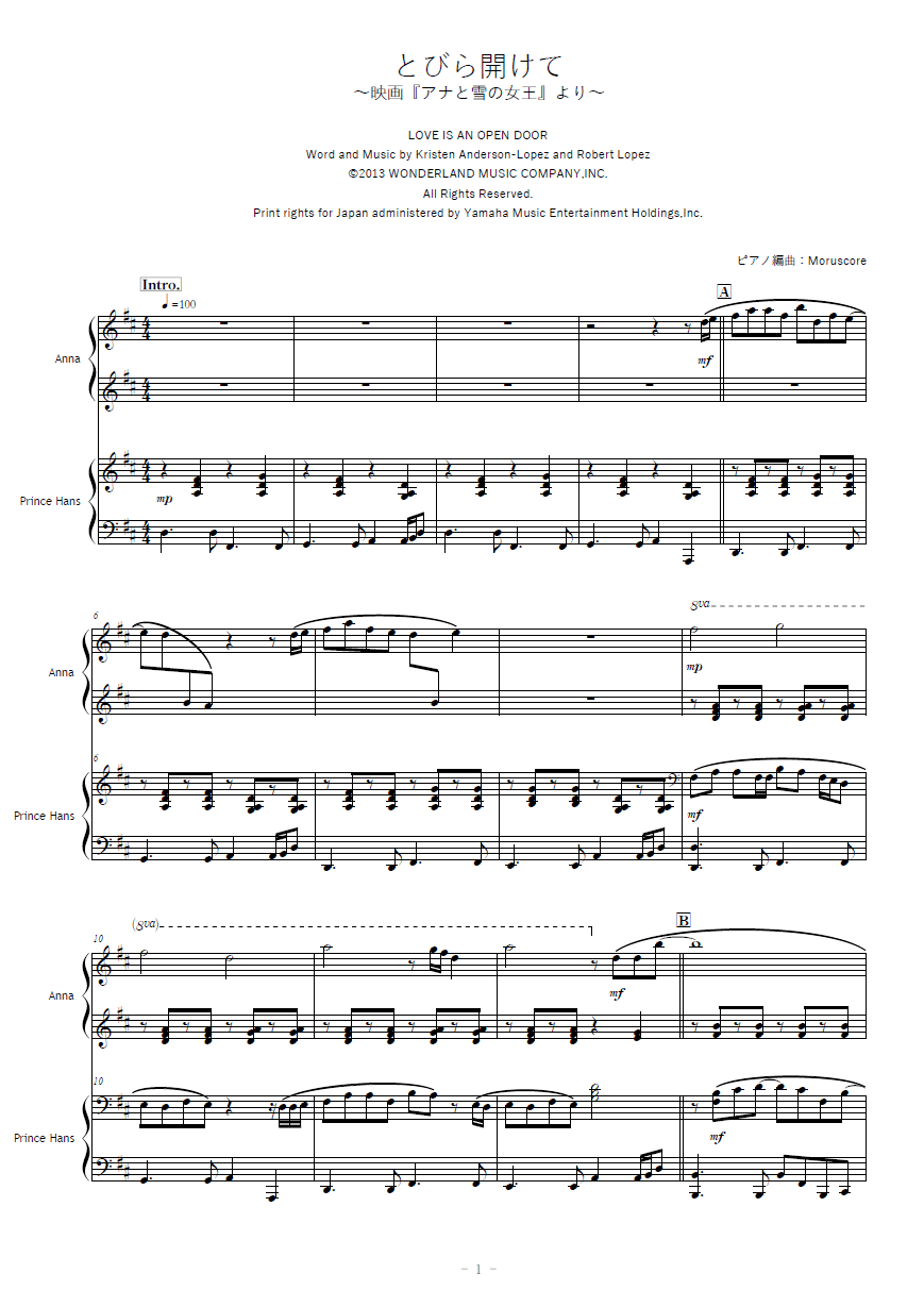 ディズニー映画『アナと雪の女王』より、アナとハンス王子の歌う『とびら開けて(LOVE IS AN OPEN DOOR)』をピアノ連弾にしました。