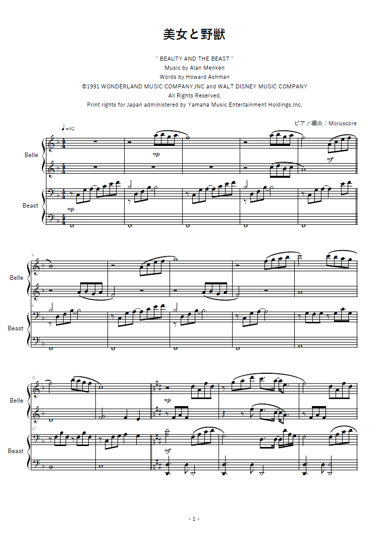 オリジナルキー、フルサイズ。二人がデュエットするように、1stがベル(Celine Dion)を、2ndがビースト(Peabo Bryson)のメロディーを担当しています。